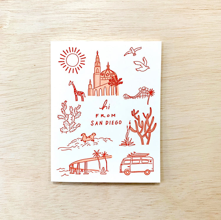 Surf's up! One card can't fully capture all the wonders of San Diego, but this one comes pretty close. You've got Balboa Park, Coronado Bridge, the roller coaster at Mission Beach, and more. Your faraway friends are sure to feel the love (and maybe a little jealousy)!