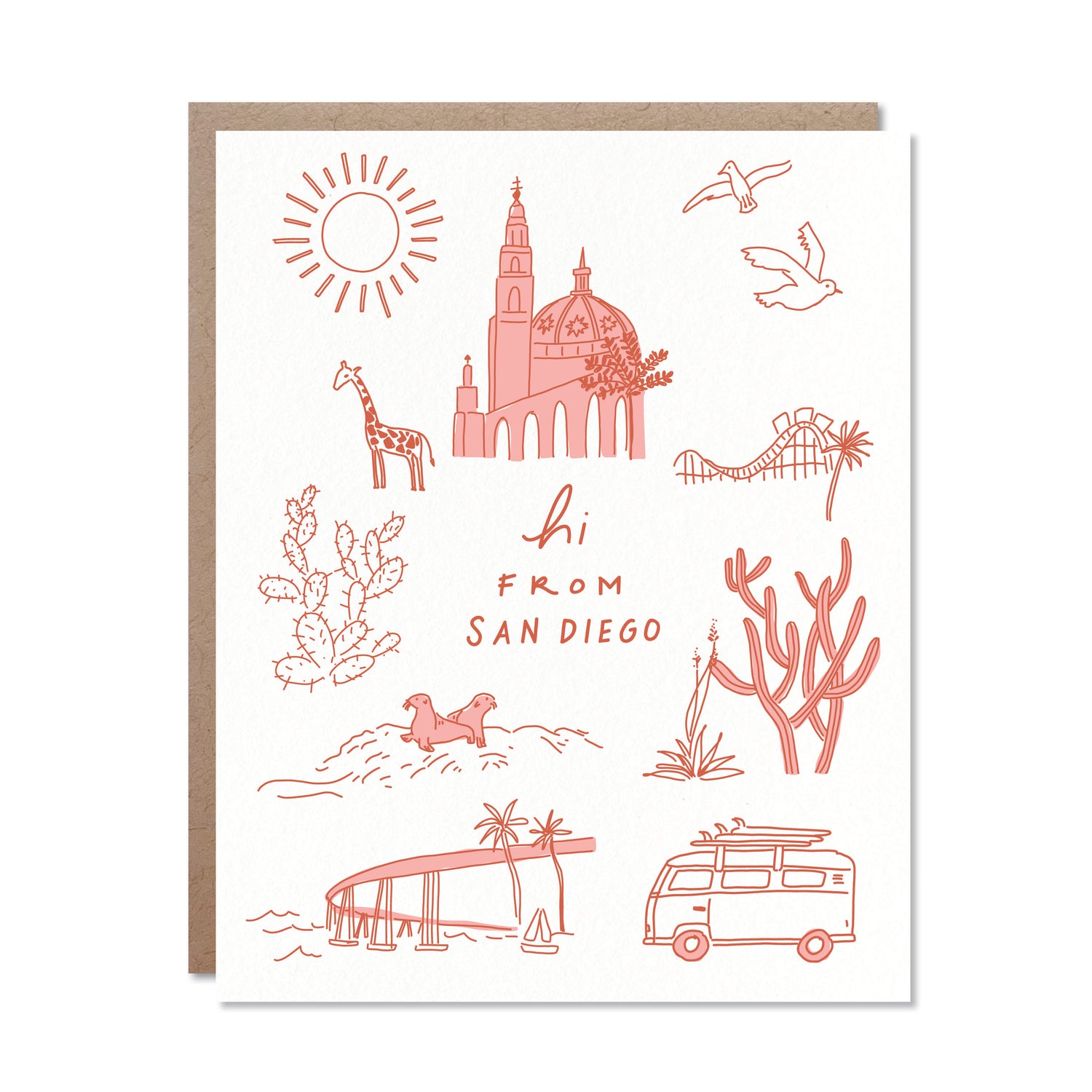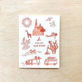 Surf's up! One card can't fully capture all the wonders of San Diego, but this one comes pretty close. You've got Balboa Park, Coronado Bridge, the roller coaster at Mission Beach, and more. Your faraway friends are sure to feel the love (and maybe a little jealousy)!
