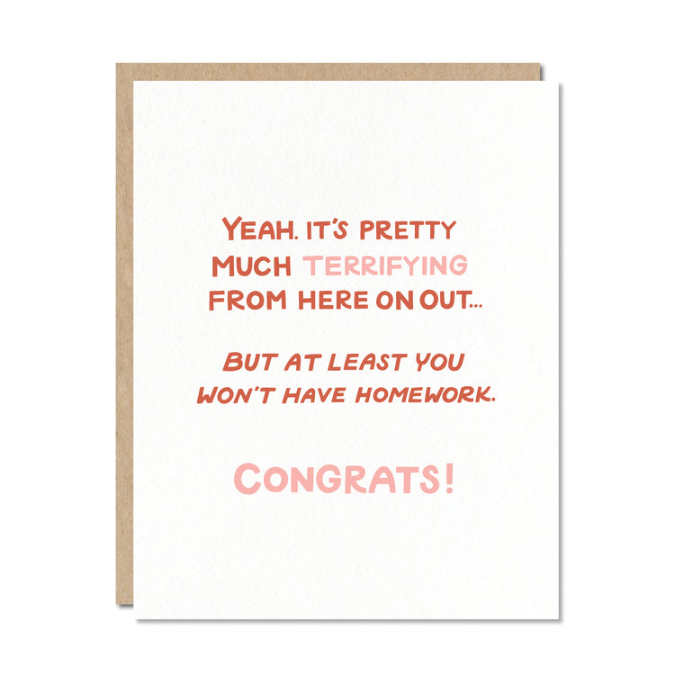 "Yeah it's pretty much TERRIFYING from here on out...But at least you won't have homework. CONGRATS!"