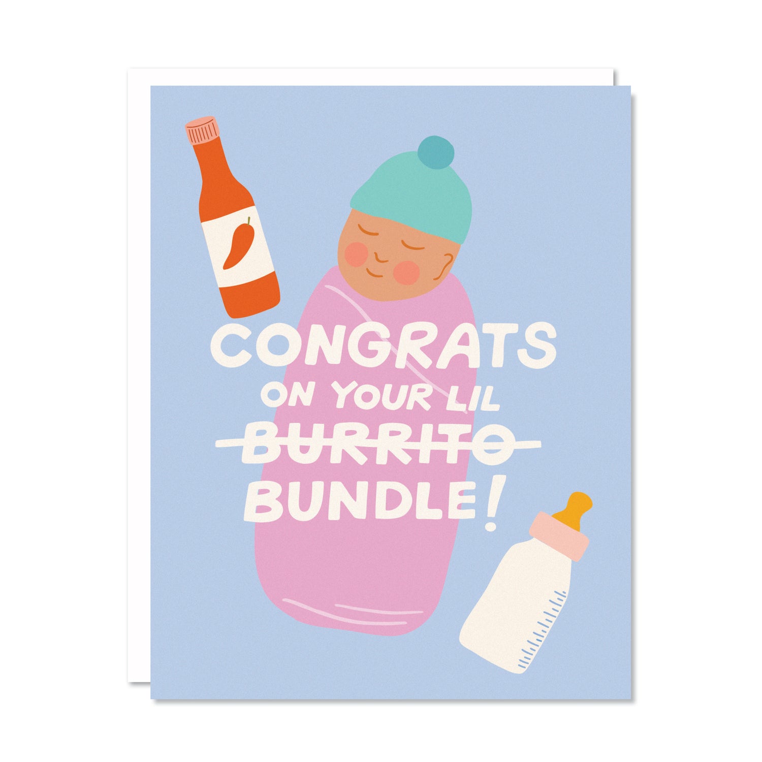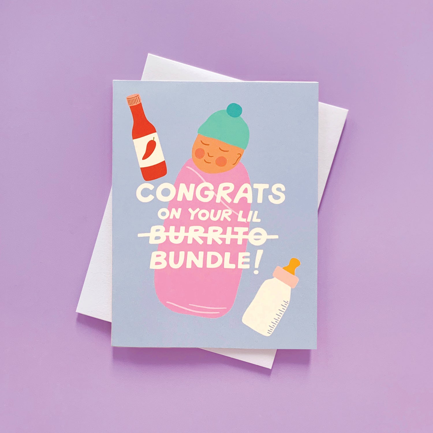 Have you ever seen a burrito as big as a baby? Or wrapped a baby like a burrito? Either way, it can sometimes be hard to tell them apart. Here's the perfect card for the parents with a new bundle of joy who also love a good burrito.