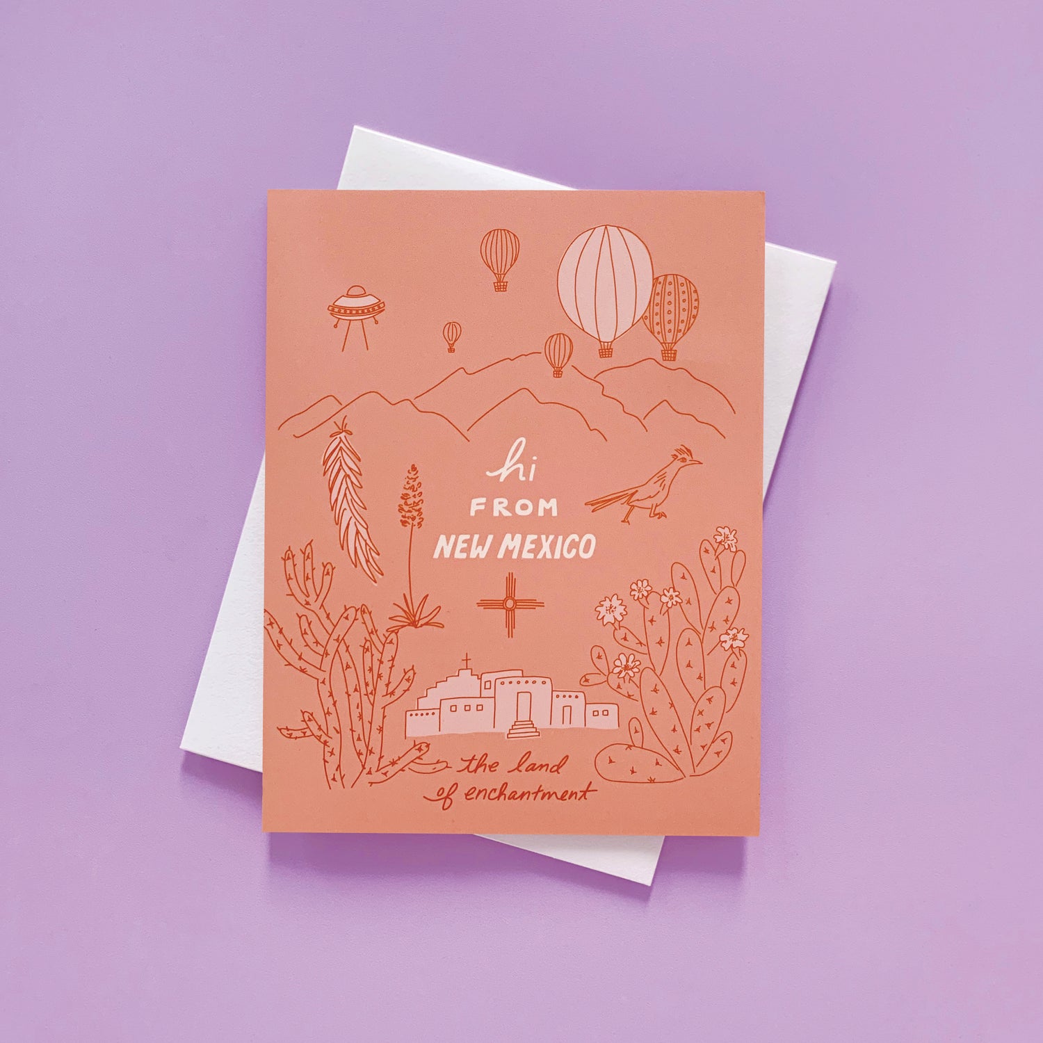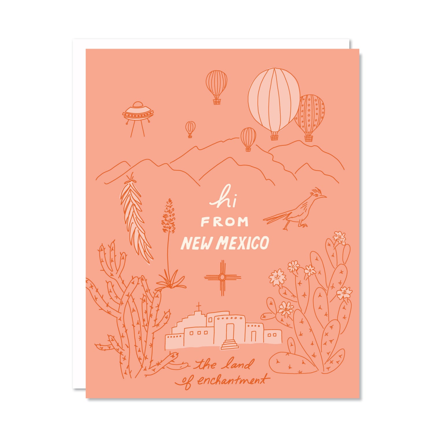 Send some greetings from the land of enchantment, featuring hand drawn illustrations of hot air balloons, ristras, cacti, a road runner, and more!