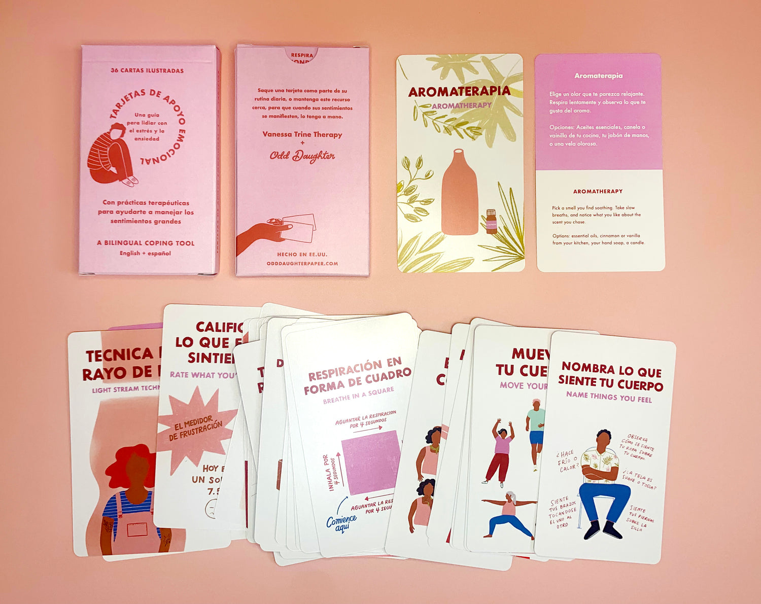 Just like the original Support Deck but in Spanish (with English translations)! We wanted this best-selling mental health resource to be accessible to even more people, so we worked with Gabriela Pineda and Jenn Guerra-Aldana to translate everything. Thanks to Jenn's suggestion, we included an English translation on each card so that it can be used in bilingual families, schools, or therapy settings.