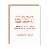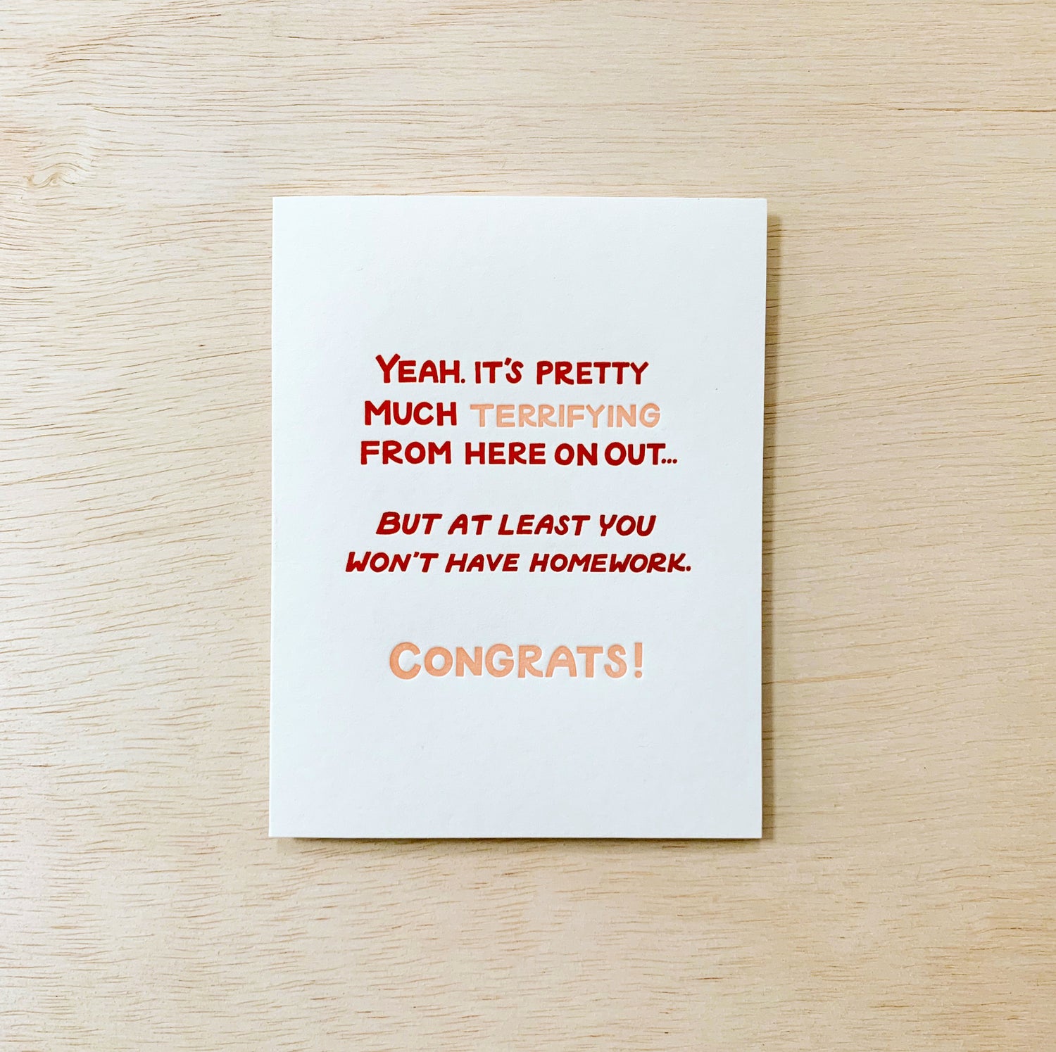 "Yeah it's pretty much TERRIFYING from here on out...But at least you won't have homework. CONGRATS!"
