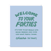 "WELCOME TO YOUR FORTIES. It's time to get really into niche hobbies and care less what people think. Cheers to that!"