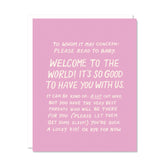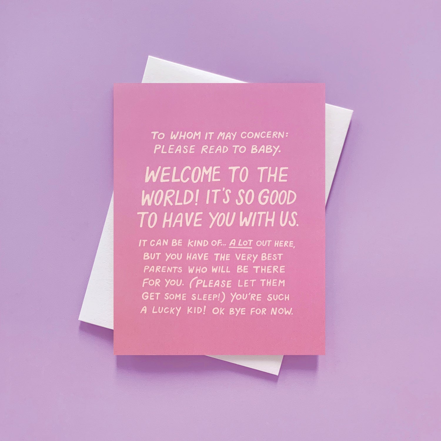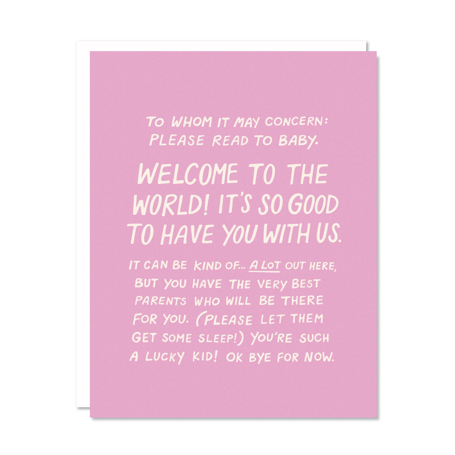 "To whom it may concern: Please read to baby. Welcome to the world! It's so good to have you with us. It can be kind of...a lot out here, but you have the very best parents who will be there for you. (Please let them get some sleep!) You're such a lucky kid! Ok bye for now."